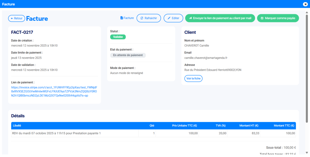 Important : Vous devez obligatoirement Validerla facture avant de pouvoir envoyer le lien de paiement au client car la facture doit passer par votre compte Stripe pour créer le lien paiement.