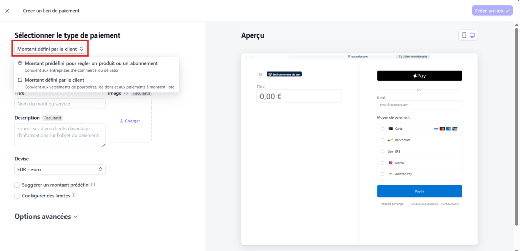 Sélectionnez “Montant défini par le client” pour créer un lien de paiement.